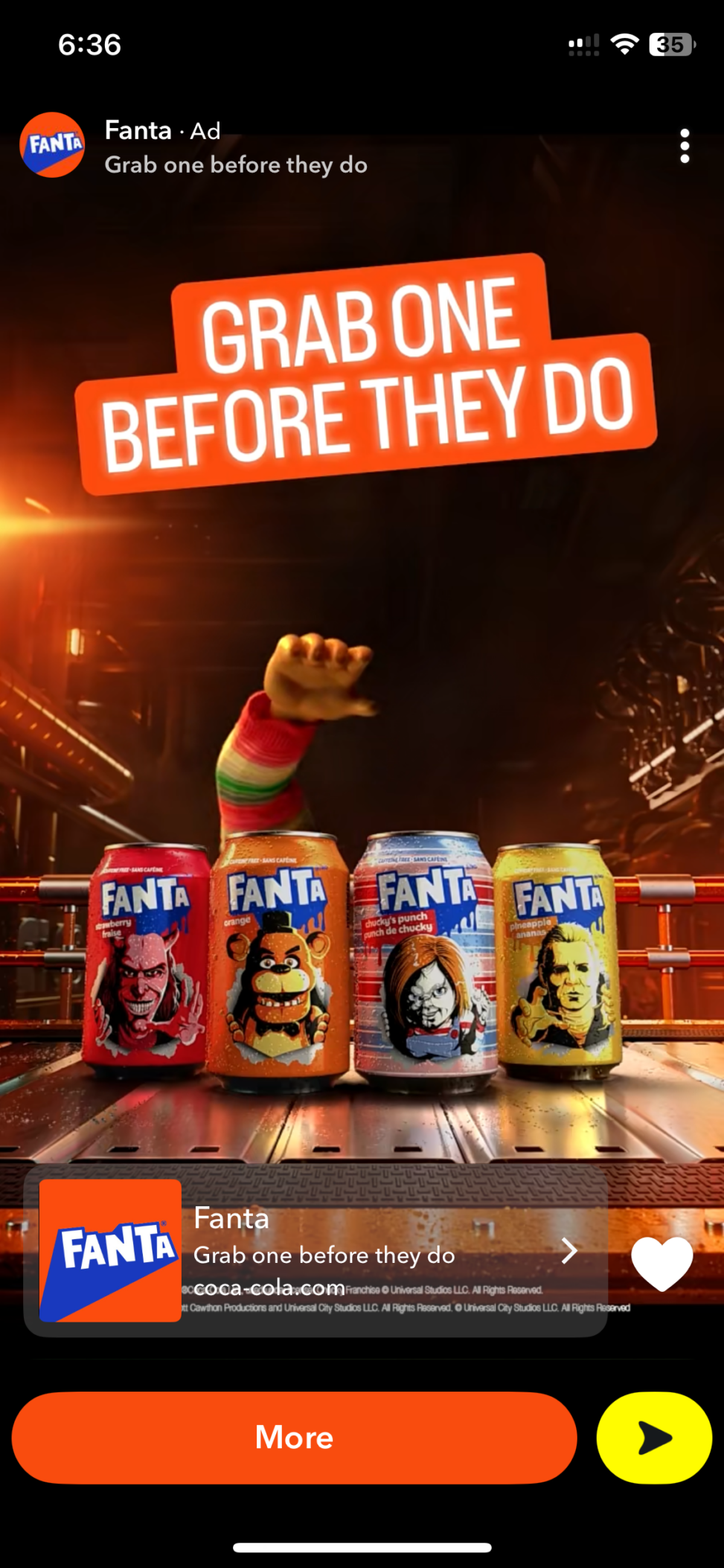 The advertisement in question above is produced by Fanta, a brand owned by The Coca-Cola Company, as part of its 2025 Halloween marketing campaign. The product being sold is flavored soda, packaged in special edition Halloween-themed cans featuring pop culture horror characters such as Chucky who can be considered an icon in the world of “Horror”, Freddy (from Five Nights at Freddy’s), and others. The ad takes the form of a still digital image advertisement, likely designed for mobile platforms such as Instagram or TikTok, where younger consumers are a primary audience.