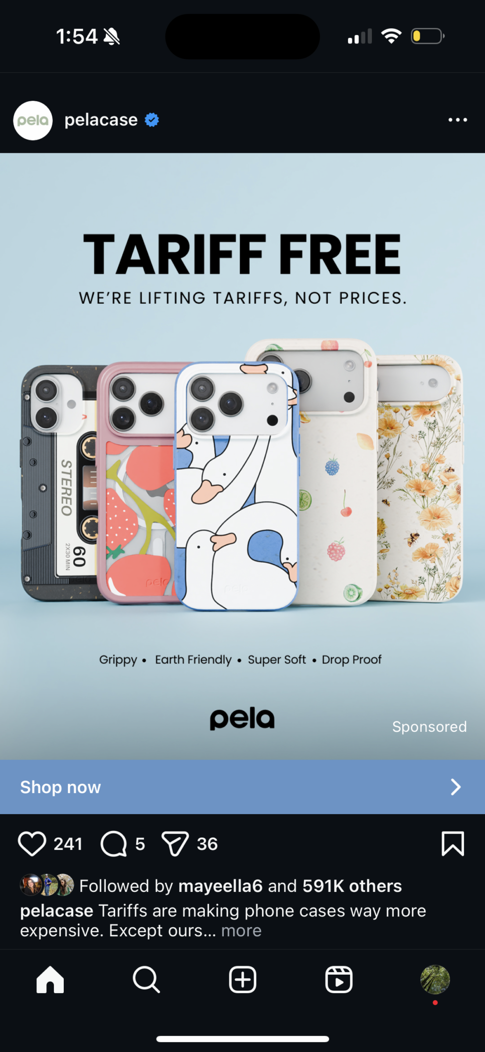 Pela is a phone case and accessories brand that prides itself on being sustainable and ecofriendly. Although their advertising strategy is usually to appeal to their audience through how their brand contributes to the environment, they have recently decided to also use the fact that they are a Canadian-based company to appeal to more consumers. Even though the hook in this advertisement is that Pela is a tariff free company, it still shows the consumer that they are a sustainable brand through words, colour, and designs.