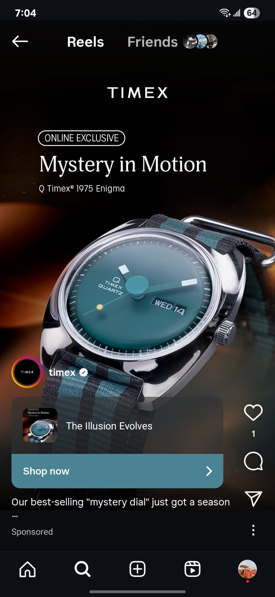 #TIMEX While scrolling through Instagram Reels, I saw a sponsored ad from Timex advertising its Q Timex 1975 Enigma watch, referred to as “Mystery in Motion.” The ad was short and elegant, a time-looping watch based on ad that had been specifically designed for the Instagram platform. It presented the product as not only a watch but as a kind of optical illusion, with the tagline “The Illusion Evolves.” This ad stood out to me because of how it framed time, technology, and style as something mysterious and exclusive. Although it did not explicitly state ecological or social responsibility, Timex has increasingly become a brand that identifies with sustainable design choices, like more durable mechanical watches, recycling packaging materials, and energy-efficient manufacturing. The advertisement consequently takes up the ground of luxury, nostalgia, and a subtle ecological undertext: buying a long-lasting timepiece is presented as being stylish as well as responsible.