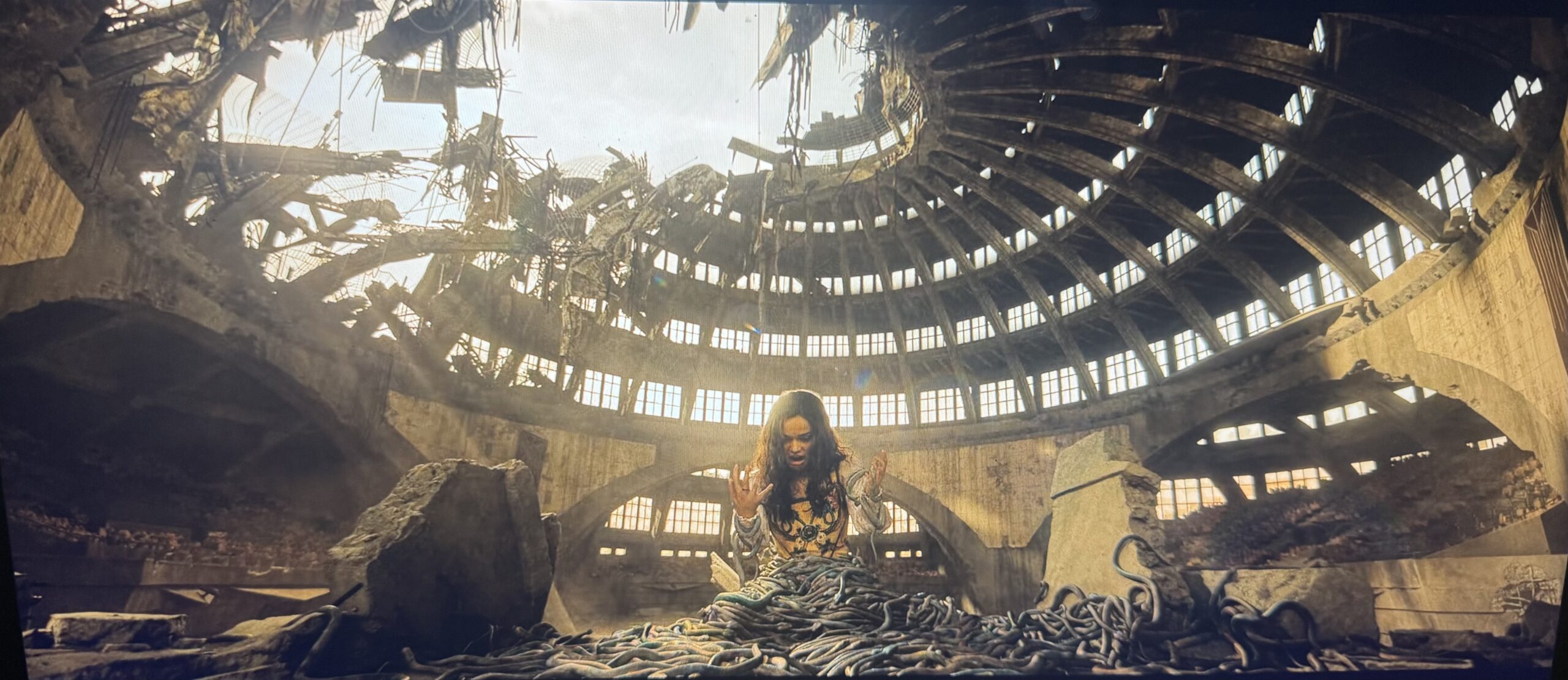her, the arena’s architecture is visible; a circular pit-like structure with a harsh industrial