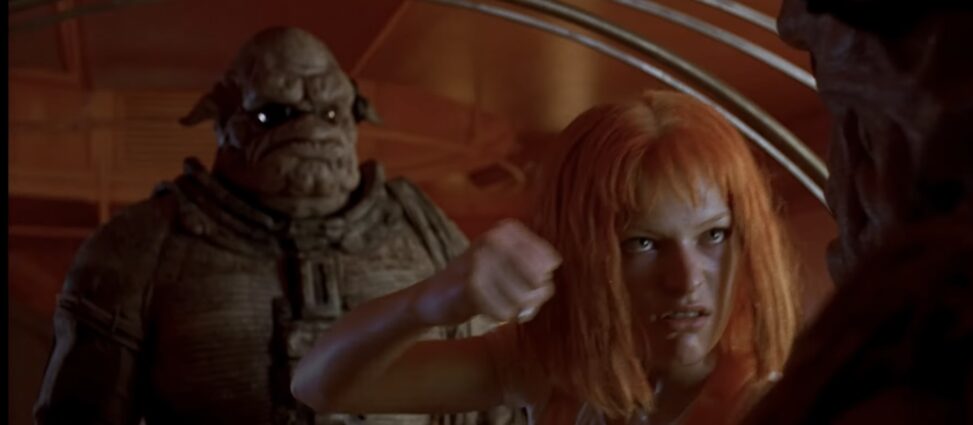 This brings me to the frame of the film I am analyzing, this moment is payback for LeeLoo. in the beginning of this movie, she was genetically engineered to be a “The Fifth Element” and stop absolute evil. The last remaining members of LeeLoo’s race were slaughtered by the warrior mercenary aliens called the Mangalores you see in the clip. The photo image I use in this clip is a favourite of mine, the Mangalores in this moment seem to think they have the upper hand, but Leeloo strikes the biggest Mangalore in the back first then the one she was lining up for a punch. Previously in this scene leading up the punch all the action has been interspliced and given a soundtrack with shots from elsewhere in the resort showing Miss Plavalaguna performing.