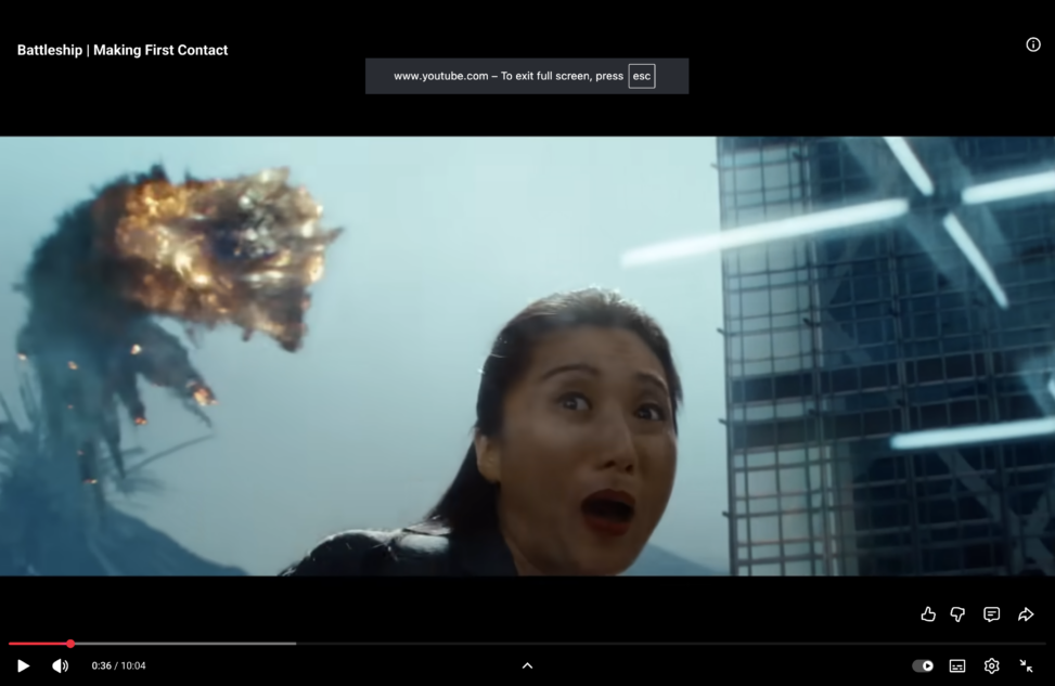 Battleship, released in 2012, is an American Hollywood action film. The sci-fi naval film, storyline follows the United States Navy when an abrupt global alien invasion occurs. Many people may be familiar with the Hasbro board game, Battleship, which is what inspired the creation of this film. The scene that will be analyzed in this essay is when the aliens first strike China. The frame within this 60 second scene that will be examined is a still image of Chinese woman in a corporate high-rise building, reacting to a shredder that is rapidly approaching the building she is in. When the alien devices first strike China, the producers of Battleship used fast speed editing, high amplitude sound, and numerous camera angles to create a dramatic visual that makes the audience feel like they are there.