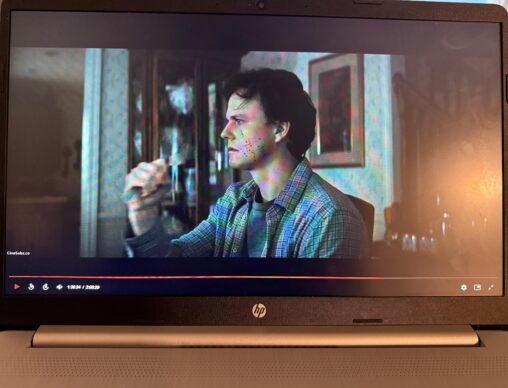 The screen grab from Weapons (2025) captures a tense moment framed within a dim, high-contrast environment that blends horror and action aesthetics. The scene highlights a cluttered interior…